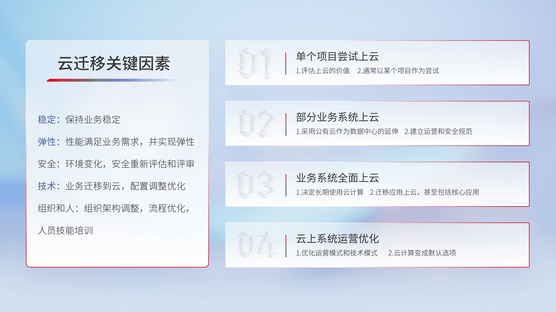 结合实际业务,,,,从规划设计、、、、云平台选型、、、、云原生改造、、数据迁移、、、集成交付,,迁移全过程为客户识别最佳上云路径,,做好风险识别管理,,设计网络架构、、身份权限、、、安全审计合规、、、操作审计、、日志审计、、、监控告警策略、、、、多站点容灾设计等,,对云上基础设施进行整体规划,,提升IT治理水平,,以满足弹性、、高可用、、、高性能的需求。。