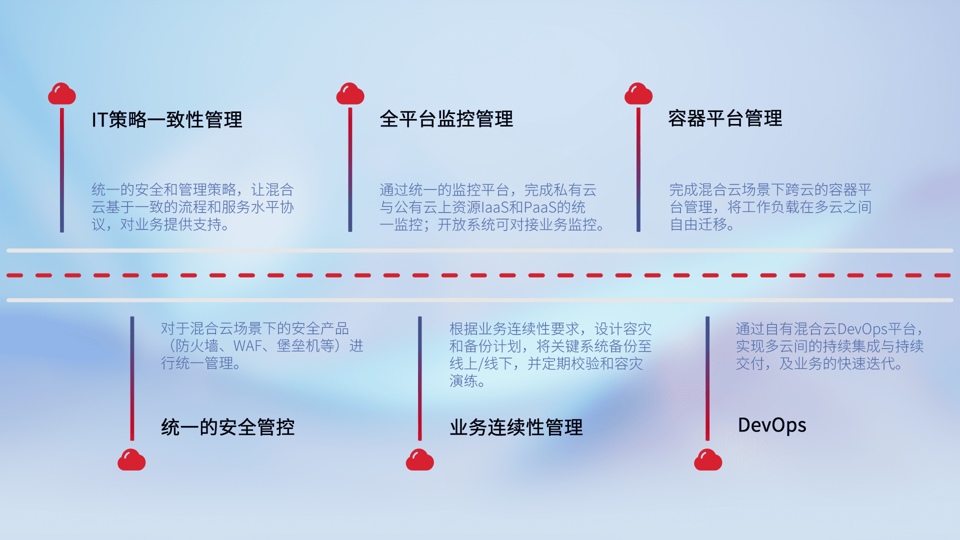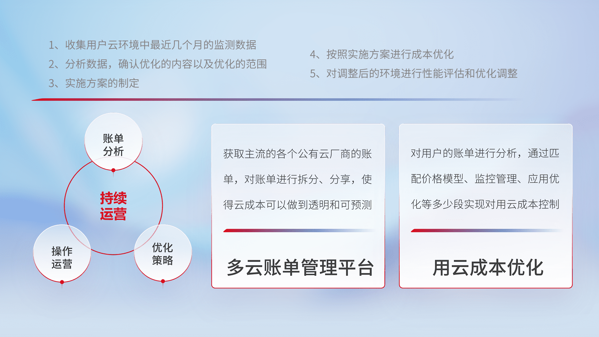 通过多云纳管,,,,以统一的资源数据模型把客户的云资源进行抽象和封装,,,,进而实现对多云资源的统一操作,,,,保障云资源管理的可靠性、、、稳定性与可用性。。。量身定制化运维内容,,配置、、开发运维、、补丁管理、、、备份、、监控、、认证和访问管理、、、审计和日常巡检等,,,保障在用云过程中的可靠度,,稳定度以及高可用率。。。