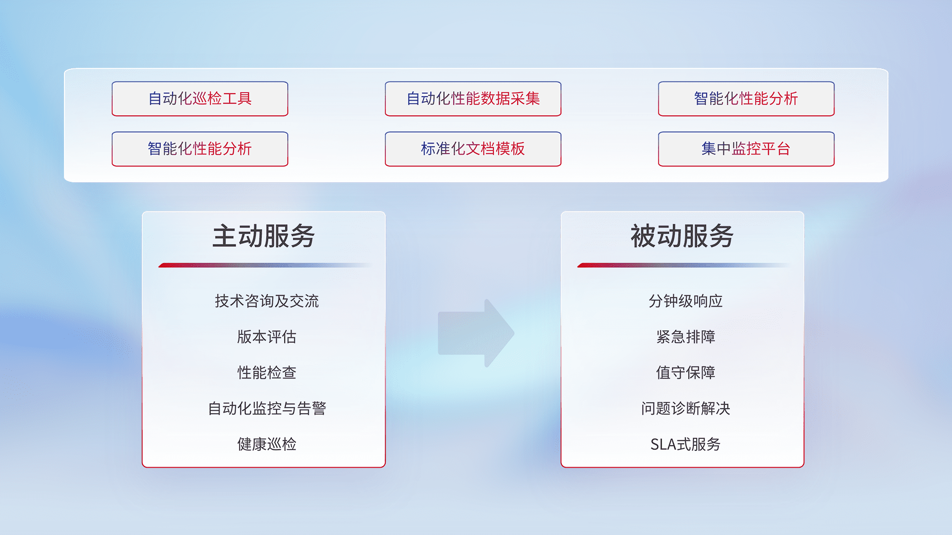 智能化工具和标准化文档,,,保障服务质量,,,,提供主动服务(包含技术咨询、、版本评估、、性能检查、、自动化监控与告警、、、、健康巡检)和被动服务包含(分钟级响应、、、、紧急排障、、、、值守保障、、、问题诊断解决、、SLA服务)。。。。
